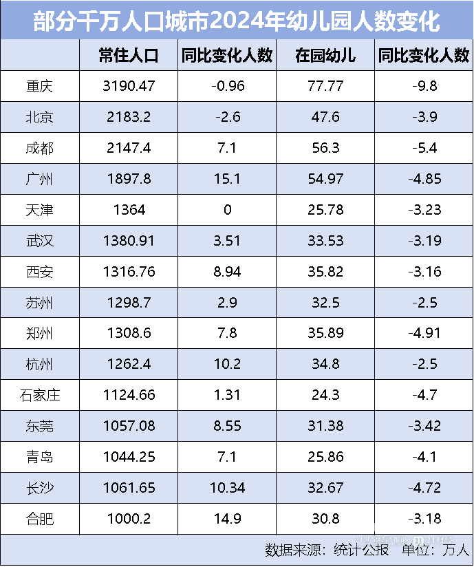 截至目前,全国常住人口超过1000万人的城市,绝大多数已经发布2024年国民经济和社会发展统计公报。21世纪经济报道记者梳理已经发布统计公报的15座超千万人口城市发现,只有个别城市2024年常住人口同比减少或持平,其余全部增长,而幼儿园在园幼儿人数则全部同比减少。