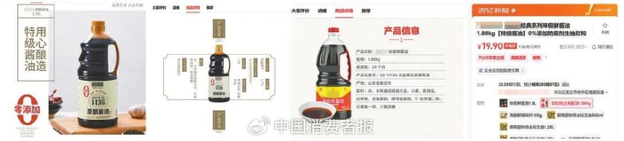 在某网购平台,记者检索到的10余款标称“0添加”或“0添加防腐剂”酱油产品中,有3款产品配料表上标注含谷氨酸钠、5‘-肌苷酸二钠、甘草酸一钾、三氯蔗糖等。1款产品标注添加了食用酒精。