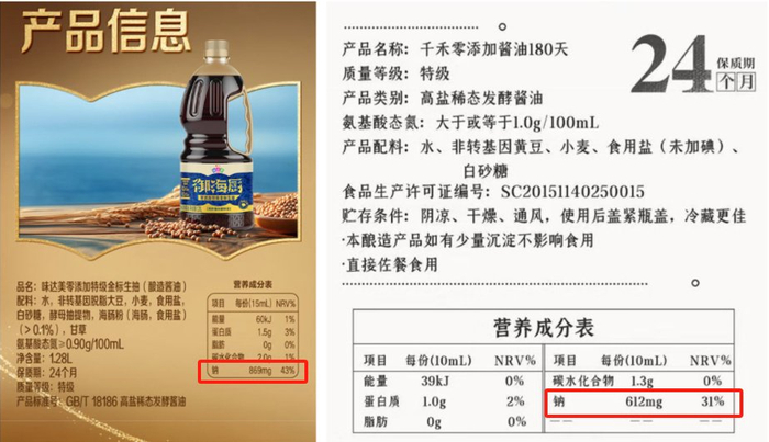 在某网购平台,记者检索到一款标称千禾零添加的酱油,其产品类别标注为“高盐稀态发酵酱油”,营养成分表则显示钠含量为612毫克(NRV营养素参考值为31%);一款标称味达美御海厨系列零添加特级金标生抽,钠含量为869毫克(NRV为43%)。