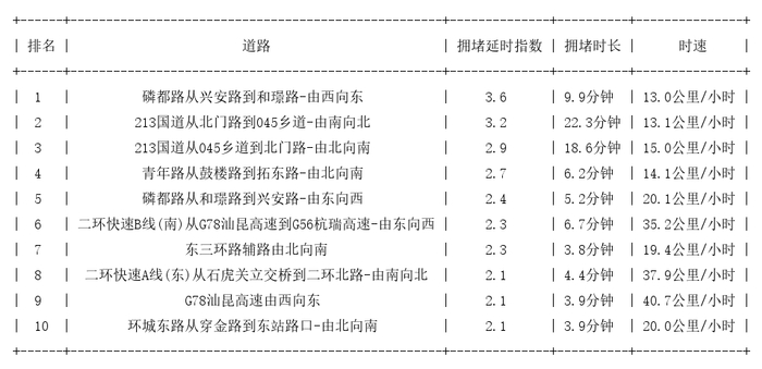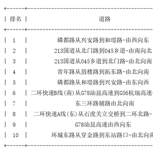 昆明道路拥堵排行榜top10: