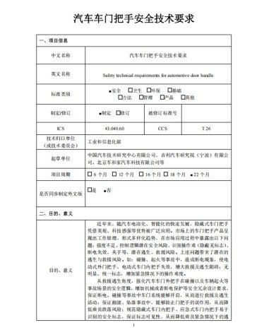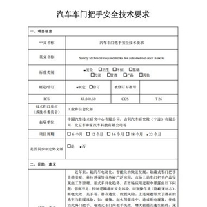 据项目建议书显示,《汽车车门把手安全技术要求》规定了汽车应急式车门内把手的安装要求、隐藏式车门内把手和应急式车门内把手的标志要求、电动式车门外把手的防夹要求与试验方法、车门外把手和车门内把手的强度要求与试验方法、电动式车门把手的动态试验要求与试验方法。