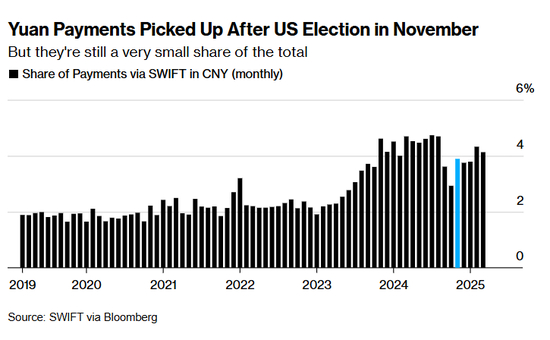 全球支付公司环球同业银行金融电讯协会(Swift)的数据显示,3月人民币占全球支付份额的约4.1%,目前仍要远低于美元49%的占比。不过,中国部分支付是通过其自建系统完成,且该系统正迅猛发展。