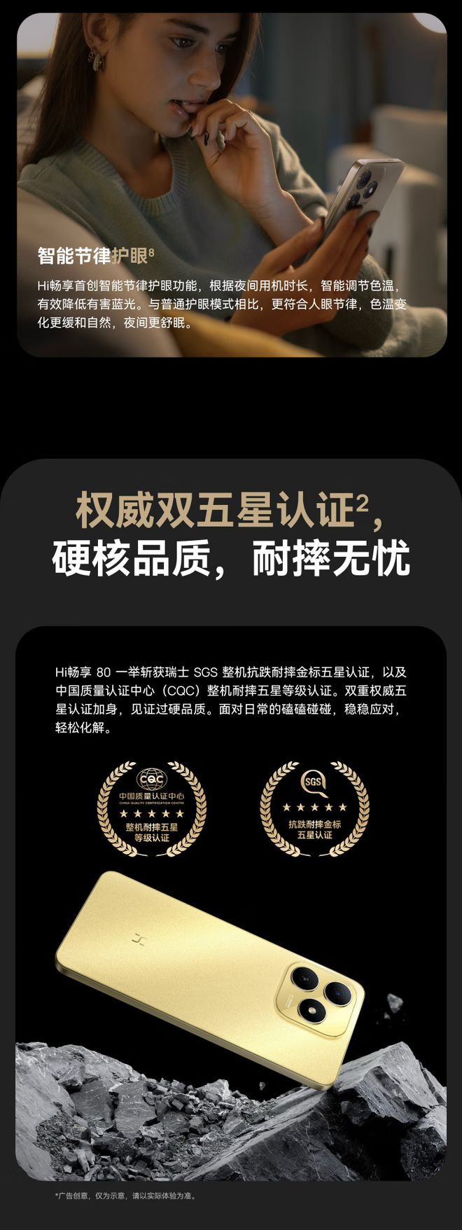 在可靠性方面,Hi 畅享 80 系列具备中国质量认证中心(CQC)整机耐摔五星等级和瑞士 SGS 整机抗跌耐摔五星金标双认证,日常跌落损坏风险进一步降低。