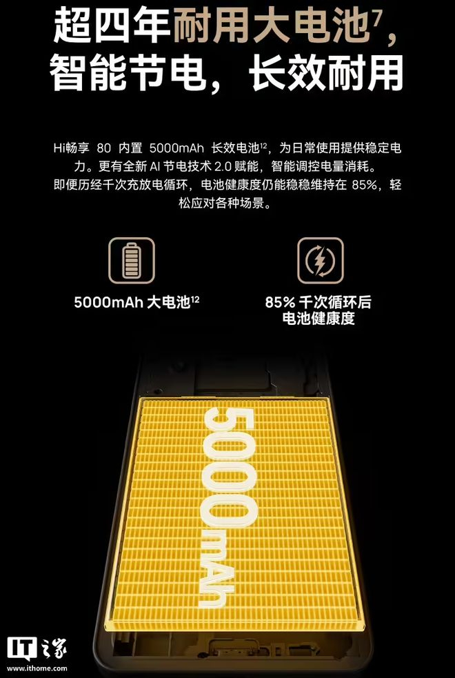 具体细节上,其支持 IP64 防尘防水,可隔绝灰尘入侵,从容应对日常泼洒、雨水侵袭等场景。其搭载的超耐用大电池,经过 1000 次充放电循环后电池健康度仍能保持 85% 以上,从根源上减少更换电池的成本。同时,5000mAh 大电量电池配合 AI 节电技术 4.2,涵盖省电精灵、显示功耗优化等八大功能,轻松满足一整天的续航需求;Hi 畅享 80S 还支持 22.5W 快充,利用洗漱、早餐等碎片时间即可快速补电,避免缺电影响通勤导航等基本需求。