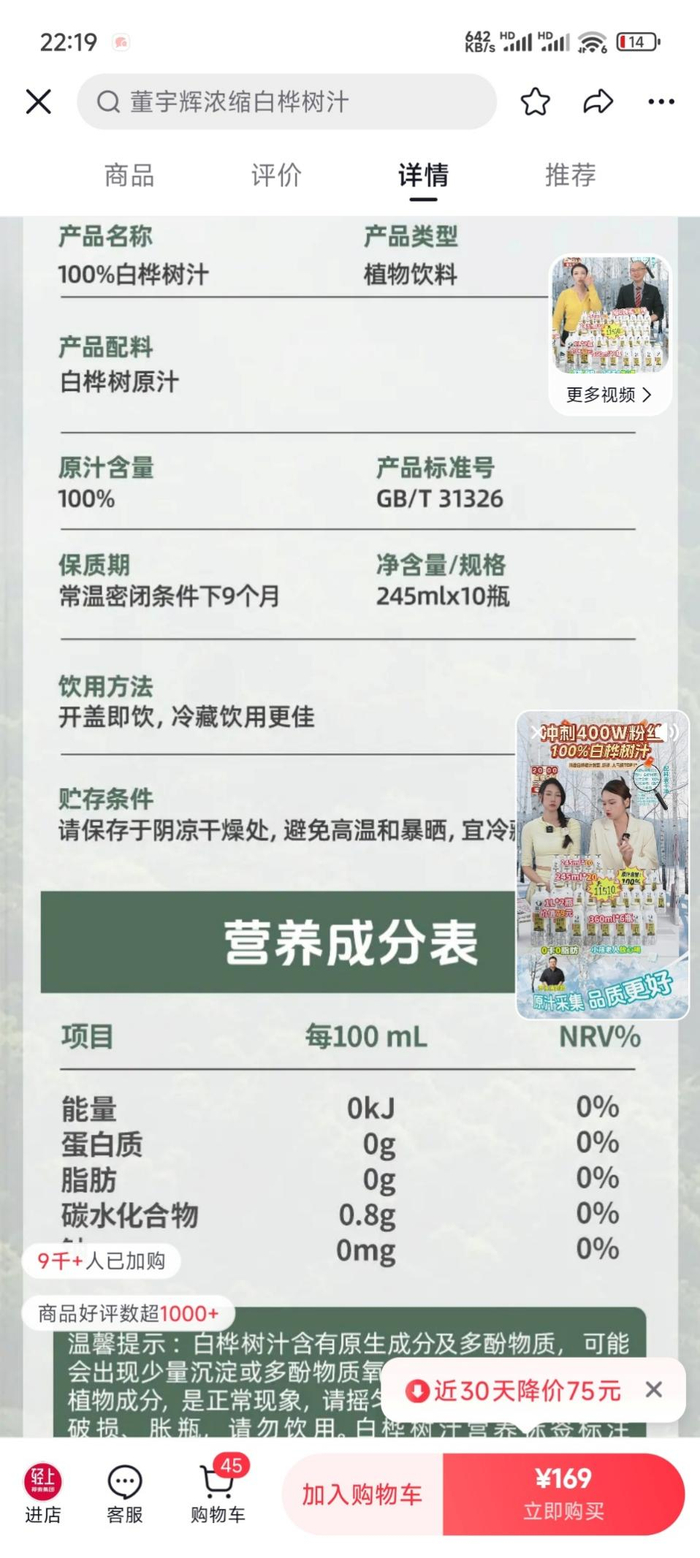 据了解,白桦树汁原液是从白桦树中提取的天然汁液,富含矿物质、氨基酸、多糖类物质及抗氧化成分,传统上被用于促进代谢、抗氧化、舒缓肌肤等。于是,主播在直播时也在暗示其具有“抗疲劳”“解酒”“糖尿病、三高可喝”等养生功能。