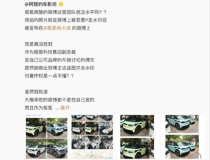 该博主对杨大成提出质疑:“作为极氪科技集团副总裁,发自己公司品牌的车做讨论的博文,居然能做出到博主这盗图并去水印,对著作权是一点不懂?”