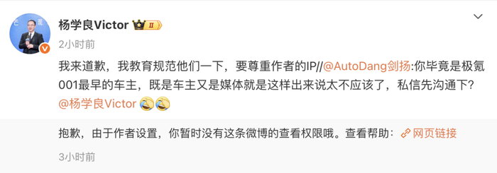 博主发文称被极氪副总裁盗图恶意P走水印,杨学良道歉:我教育规范他们一下