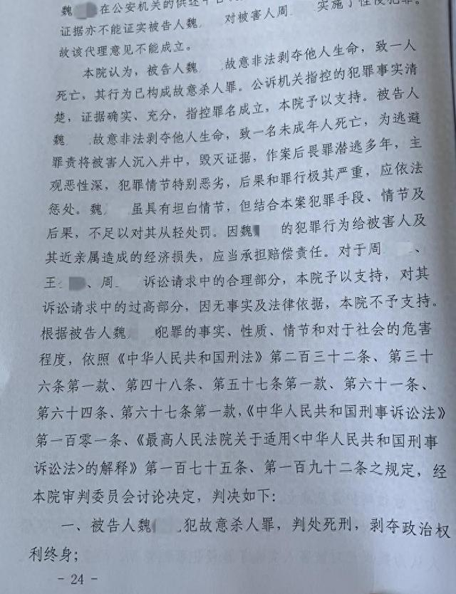 2023年10月31日,河南省信阳市中级人民法院判决魏某犯故意杀人罪,判处死刑。