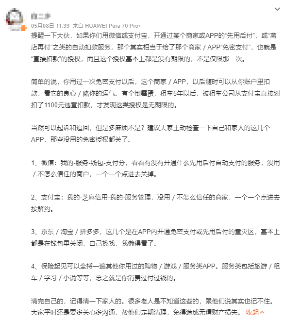 有网友发帖称开通某个商家或APP的“先用后付”或“离店再付”之类的自动扣款服务后是给了对方直接扣款的授权,这一授权没有期限,用过一次免密支付后商家随时可以直接从账户扣款。不少网友担心自己的资金安全。