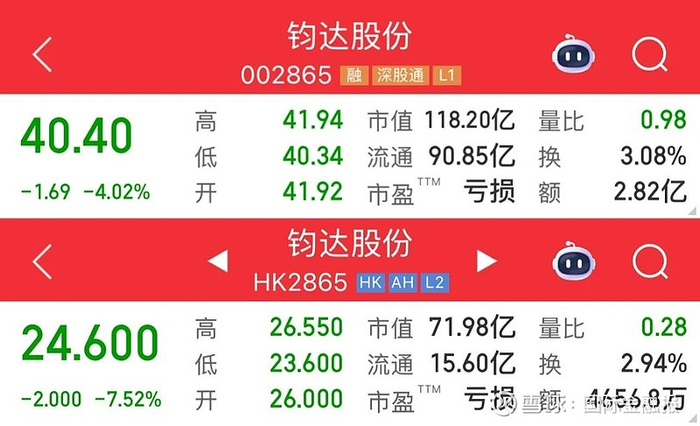 5月9日,钧达股份A股、H股齐跌,分别收跌4.02%、7.52%。
