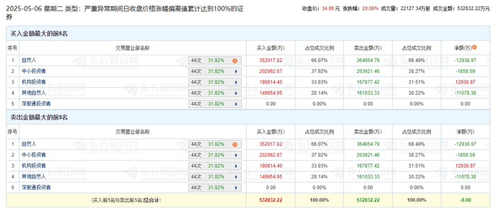 自然人席位以35.20亿元位列买入首位,中小投资者、机构投资者分别以20.21亿元、18.08亿元紧随其后,其他自然人及深股通投资者也出现在名单中;卖方名单中,自然人席位同样占据主导地位。