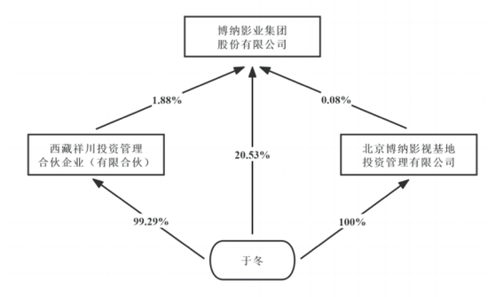 截至去年年末,于冬直接持有博纳影业20.53%的股份。与此同时,西藏祥川投资管理合伙企业(有限合伙)、北京博纳影视基地投资管理有限公司分别持有博纳影业1.88%、0.08%的股份。天眼查显示,前述两家企业的实际控制人均为于冬。