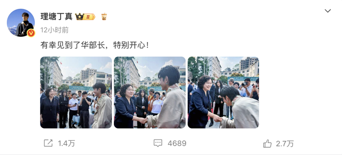 5月9日,演员@理塘丁真 发布微博称“有幸见到了华部长,特别开心”。