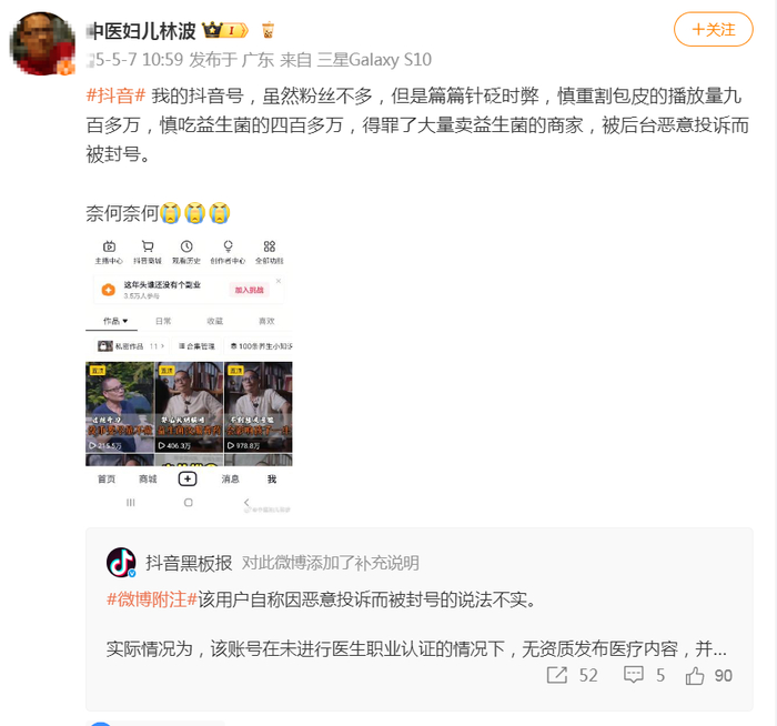 5月9日,抖音黑板报发布@中医妇儿林波 用户自称因恶意投诉而被封号的说法不实。