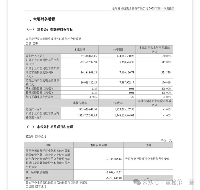 不过,豪尔赛的业绩表现却差强人意。2025年一季报显示,公司实现营业收入5754.89万元,同比下降60.05%;净利润-2239.8万元。另据2024年年报显示,公司去年净利润为-1.79亿元。