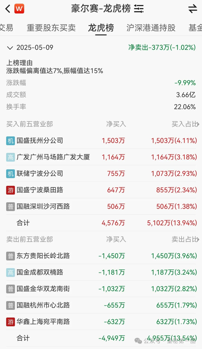 在连续两日涨停后,5月9日豪尔赛股价“风云突变”,公司股票早盘以涨停价高开后,资金迅速撤离,公司股价从涨停板直线下挫,并在尾盘封死跌停板,盘后数据显示,知名游资当日仍争相博弈豪尔赛。