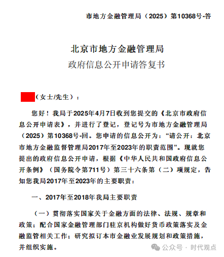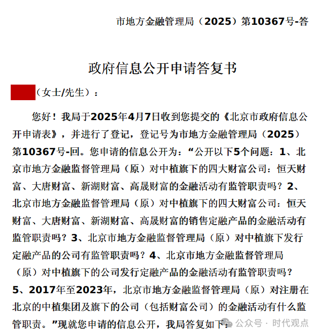 2、北京市地方金融监督管理局(原)对中植旗下的四大财富公司:恒天财富、大唐财富、新湖财富、高晟财富的销售定融产品的金融活动有监管职责吗?