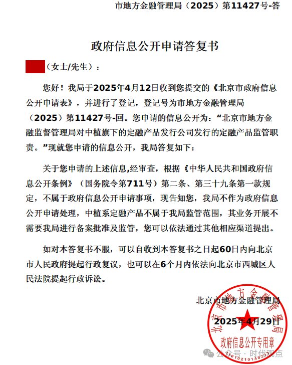 3、北京市地方金融监督管理局(原)对中植旗下发行定融产品的公司有监管职责吗?