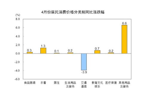 其他七大类价格同比六涨一降。其中,其他用品及服务、衣着、教育文化娱乐价格分别上涨6.6%、1.3%和0.7%,生活用品及服务、医疗保健、居住价格分别上涨0.2%、0.2%和0.1%;交通通信价格下降3.9%。