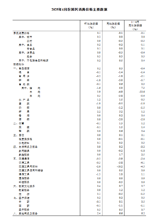 国家统计局:2025年4月份居民消费价格同比下降0.1%