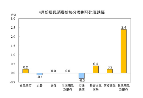 4月份,全国居民消费价格环比上涨0.1%。其中,城市上涨0.2%,农村持平;食品价格上涨0.2%,非食品价格上涨0.1%;消费品价格持平,服务价格上涨0.3%。