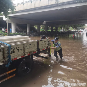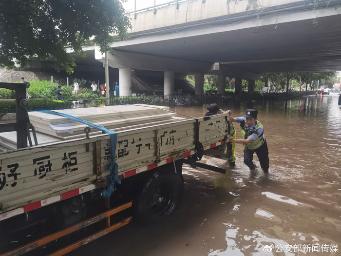 15时许,集美分局交警大队后溪中队执勤人员巡逻到集美大道积水路段时,发现一辆小货车在积水区域突发故障抛锚。此时,积水已经没过车轮,驾驶人焦急万分。执勤人员立即涉水来到被困车辆边,化身“推车侠”,齐心协力将车辆推出积水区域。