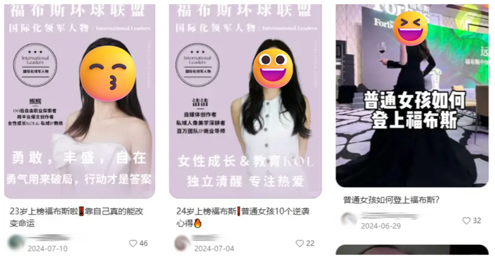 《普通女孩如何登上福布斯》的攻略视频教你如何“向上社交”;《24岁上榜福布斯!普通女孩10个逆袭心得》则在讲述了自己“从农村到加入高能量圈子”的人生历程后,郑重艾特出一个“国际化咨询”的中介账号,“与有荣焉”。