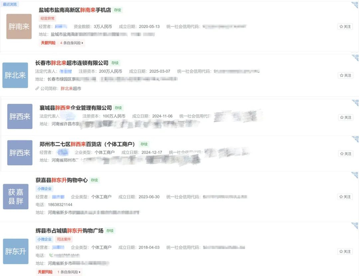 经天眼查搜索发现,除“胖都来”外,目前,与胖东来近似的“胖西来”“胖南来”“胖北来”比比皆是。