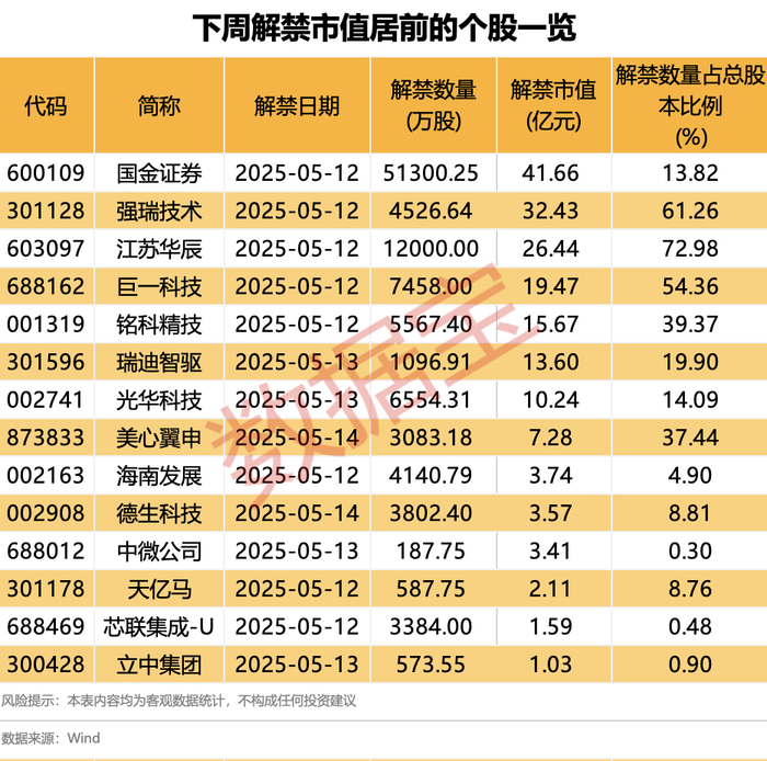 国金证券下周将有5.13亿股上市流通,主要为定向增发机构配售股份,解禁市值达41.66亿元。