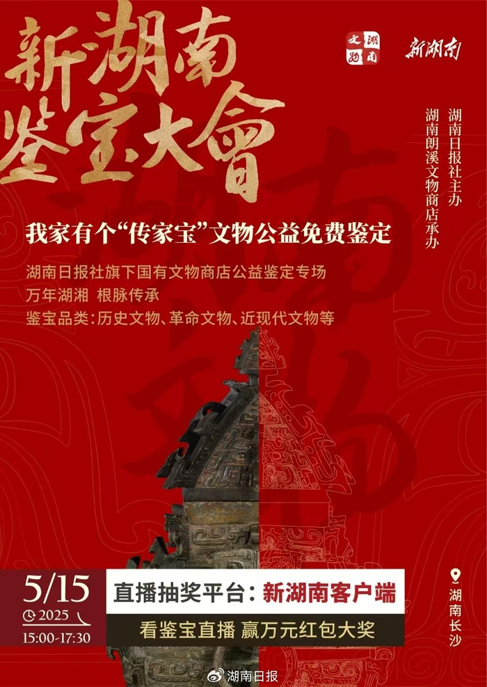 5月15号(周四)下午2:30-5:00 ,由湖南日报社主办、湖南朗溪文物商店承办的新湖南鉴宝大会——我家有个“传家宝”文物公益鉴定活动将在新湖南大厦举办,专家现场为您鉴宝。