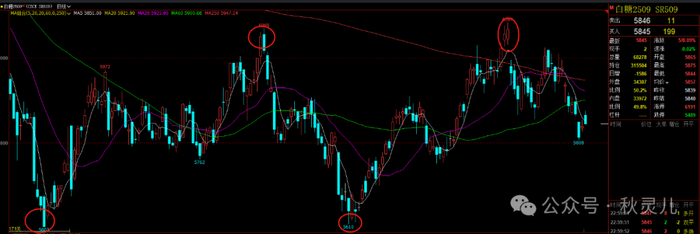从白糖的K线图来看,白糖当前处于腰部。