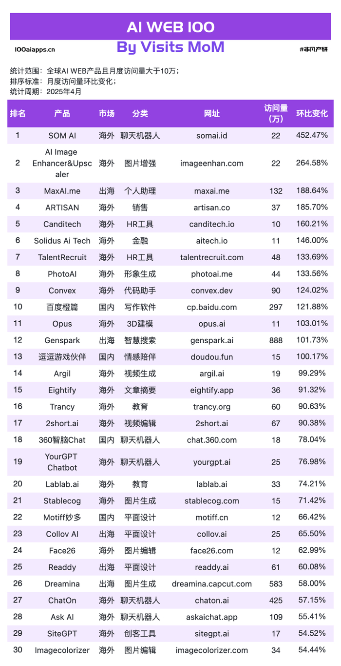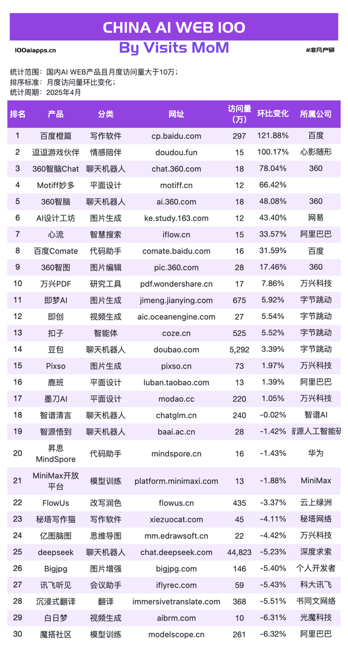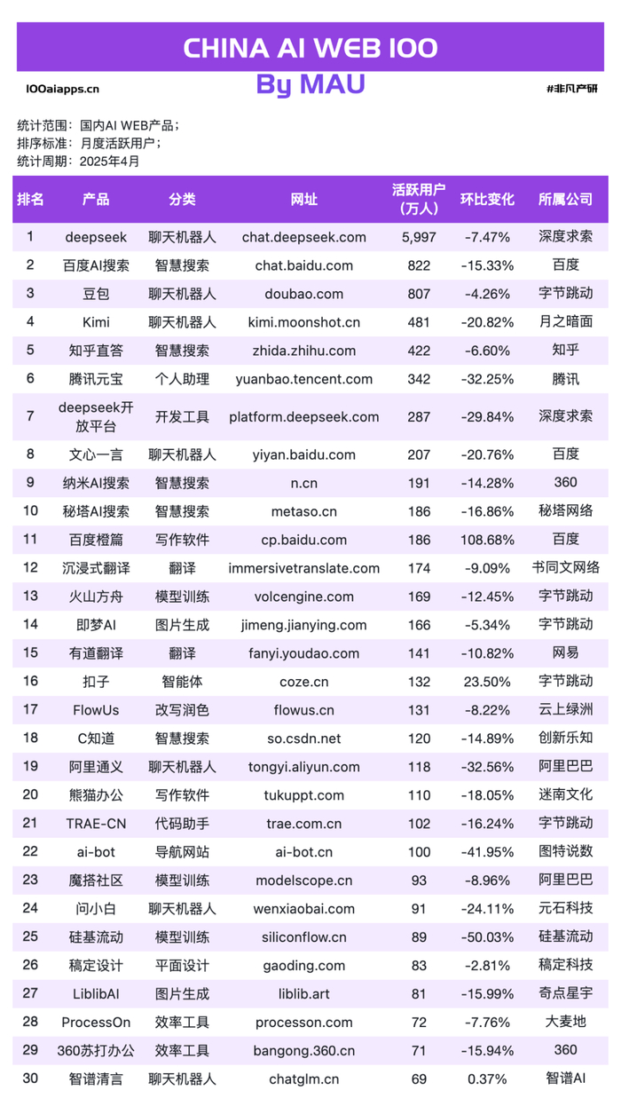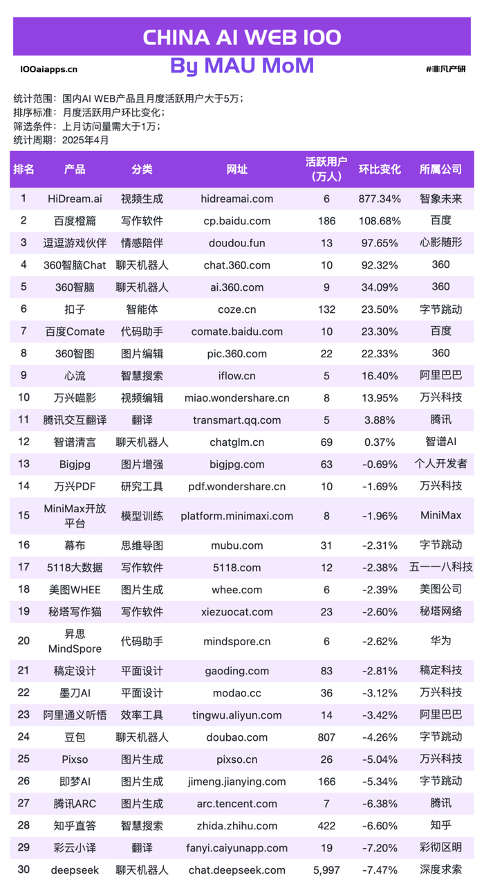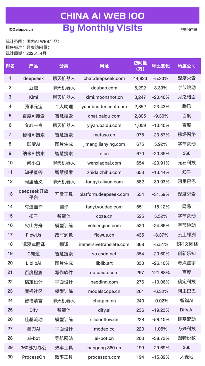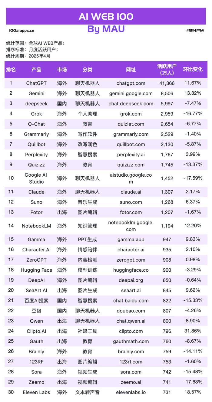 非凡产研发布的2025年4月AI产品榜单明细如下: