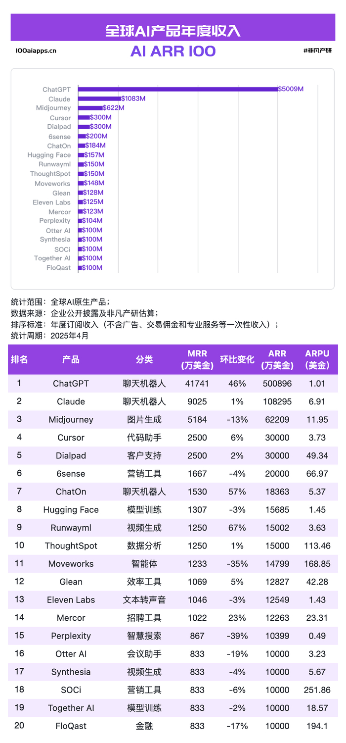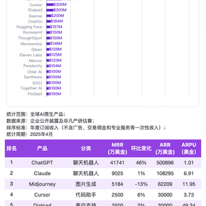 当 ChatGPT 的年度经常性收入(ARR)率先突破 50 亿美元,整整拉开第二名 Claude 四倍以上差距时,我们也见证了“后流量时代”最激烈的一次排位赛:Midjourney、Cursor、Dialpad 等垂直应用迅速抢占腰部高地,ThoughtSpot、Moveworks 等 B2B 选手则通过高 ARPU 展示强劲变现韧性。与此同时,以 KLING AI、manus 为代表的新锐产品正用 8 倍左右的月度增速,把“涨停板”的概念从资本市场搬到了 ARR 榜单——视频生成与智能体赛道的商业化拐点已悄然出现。