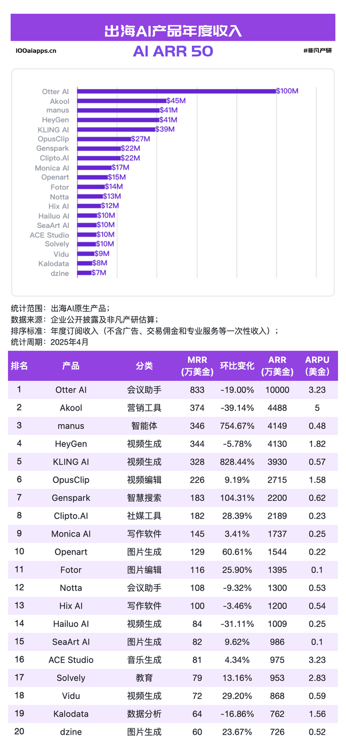 根据非凡产研的统计,截至2025年4月份,达到1000万美金ARR(年经常性收入)及以上的中国AI应用有20家左右。我们将持续关注和监测全球AI应用的流量和收入变化。