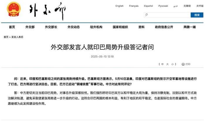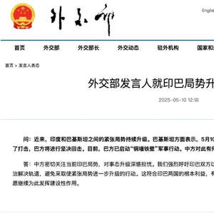 问:近来,印度和巴基斯坦之间的紧张局势持续升级。巴基斯坦方面表示,5月10日凌晨,印度对巴基斯坦的努尔汗空军基地等设施进行了打击,巴方将进行坚决回击。目前,巴方已启动“铜墙铁壁”军事行动。中方对此有何评论?