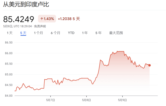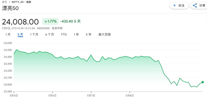 继5月8日收跌0.58%后,印度的基准Nifty 50指数9日又收跌1.1%。印度卢比兑美元8日跌破85.50关口,为2022年2月以来最大跌幅。同日,印度VIX恐慌指数攀升至21.85,达到4月7日以来的最高点。分析人士表示,这一数据反映出市场对印度经济和金融局势的担忧情绪显著上升。