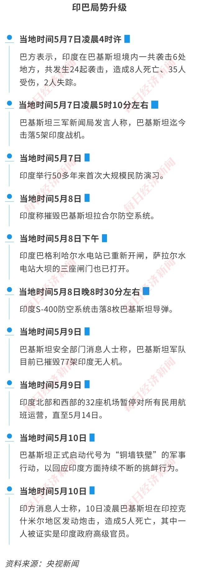 5月10日,巴基斯坦正式启动代号为“铜墙铁壁”的军事行动,以回应印度方面持续不断的挑衅行为。据悉,此次行动针对印度境内多个目标展开,打击范围覆盖印度全国多个区域。巴基斯坦称,首轮行动已经打击了印度旁遮普邦的一处导弹储存设施。印方对此暂无回应。另外,据巴基斯坦军方消息人士称,巴对印度发动网络攻击,致使印度约70%电网瘫痪。