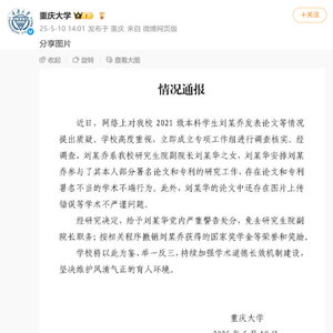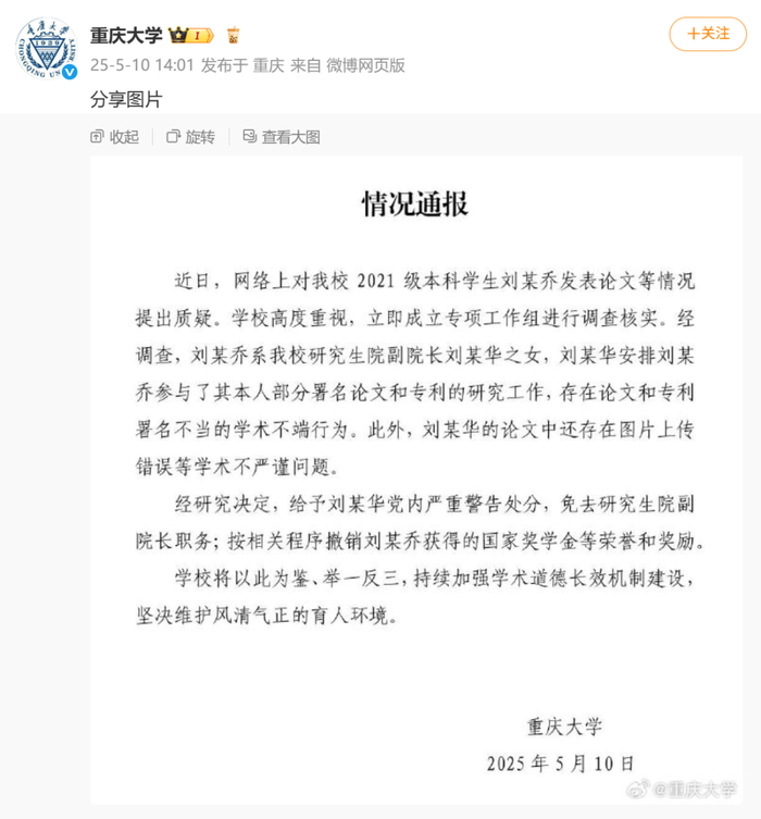 5月10日,重庆大学针对“本科生发14篇SCI论文”一事发布最新情况通报: