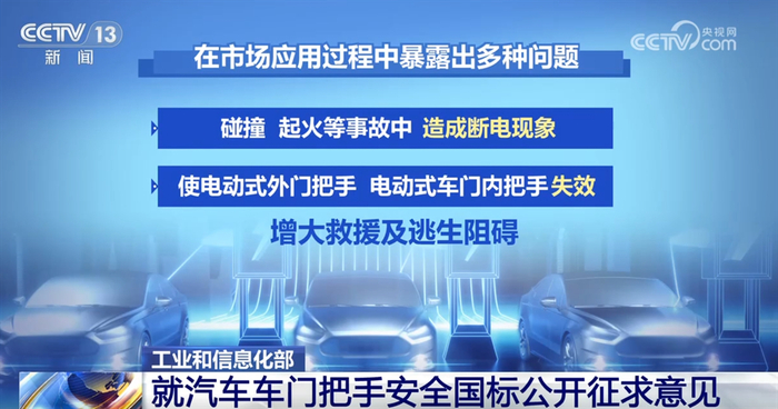 记者9日从工业和信息化部获悉,针对隐藏式车门把手在实际应用过程中暴露出来的一些问题,工业和信息化部公开征集对《汽车车门把手安全技术要求》强制性国家标准制修订计划项目的意见。