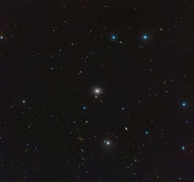 超大巡天望远镜(VST)在这里捕捉到了一个充满各种星系的“动物园”,填满了太空中的空虚。在这个多彩多样的星系群中心,是椭圆星系 NGC 3640,它就位于较小的邻居星系 NGC 3641 的上方。天文学家特别关注这两个星系之间的互动方式,通过研究它们古老星团的群体来探究它们的共同历史。