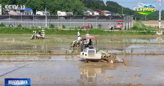 等田地整好之后,一盘盘青绿色的秧苗就可以陆续下田了。今年,种植户选择了产量高、抗倒伏、品质也更高的良种。这几台插秧机都是无人驾驶的,装了北斗的导航系统和避障设备,能精准按照规划好的路线进行插秧。