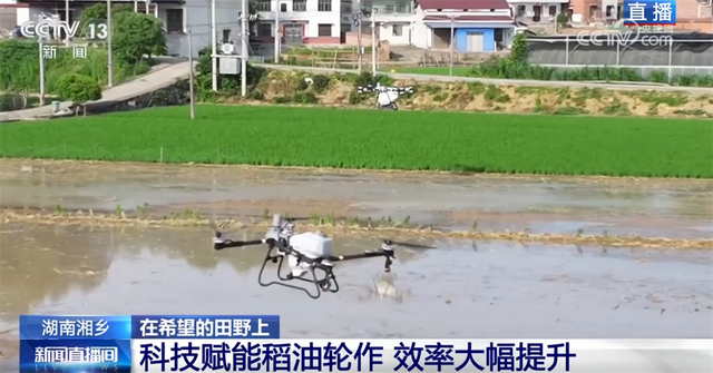 在这个阶段,还有一件非常重要的工作就是施肥。眼下,施肥已经很少依靠人工了。现场,大型的农业无人机正在作业,肥料均匀洒在田里。无人机还能做到自动避障、自动调节喷洒量,配备光谱仪还可以检测庄稼的长势,作业1亩地只需要不到20秒。