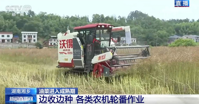 在一眼望不到头的田里,各类农机正在火热作业。首先,不少油菜籽已经成熟了,不远处,专业的收割机正在迅速采收,确保颗粒归仓。种植户介绍,今年得益于气候和农田改造,油菜籽的亩产有所增加。