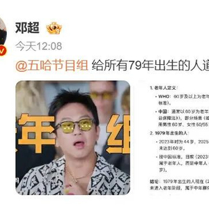 近期,邓超在综艺节目《哈哈哈哈哈》第五季中因年龄分组问题引发热议。节目中,1979年出生的他被划入“老年组”,对此他通过智能助手DeepSeek查询年龄标准,确认46岁属于中年人后,今天,邓超特地在社交平台上@五哈节目组 给所有79年出生的人道歉!