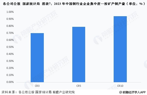 按矿产铜产量来看,我国铜生产企业繁多,以中小型企业为主,铜行业企业集中度极低,CR3仅0.7%,CR5为0.19%,而CR10则为0.94%,均小于1%。