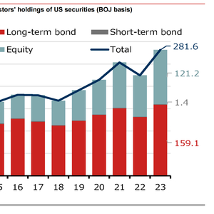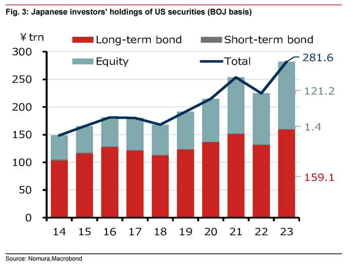 根据美国财政部国际资本流动(TIC)数据,截至2025年2月底,日本投资者持有约2.7万亿美元(402万亿日元)的美国证券(不含短期证券)。
