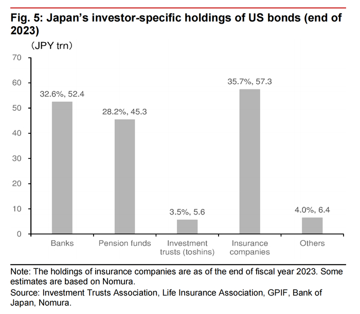 野村证券研究表明,日本投资者持有的美国资产中,约35%可能导致主动"撤离美元"。这部分资产主要由保险公司持有的美国债券及零售投资者通过投资信托持有的美国股票构成。