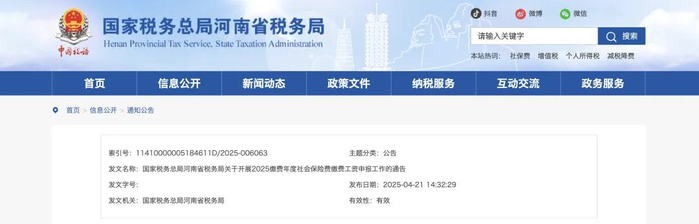 三、河南省:5月1日起开展2025缴费年度社会保险费缴费工资申报