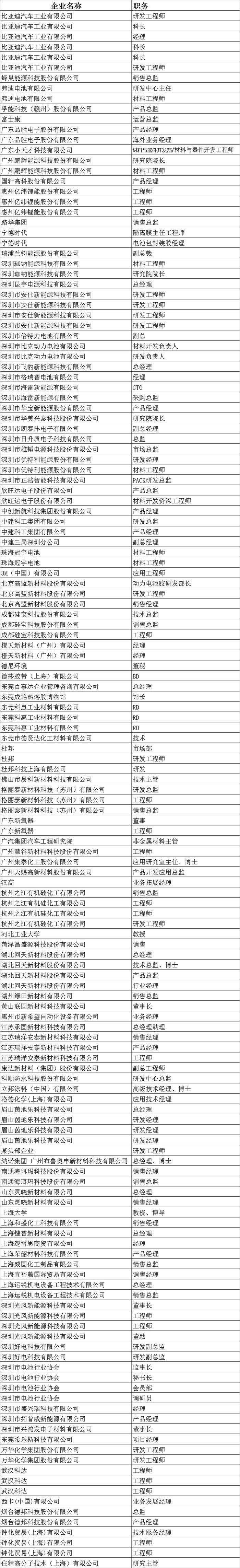 汉高、3M、德莎、西卡、杜邦、洛德、立邦、亮克威泽、钟化、回天、硅宝、康达、德邦、集泰、天赐、之江、好电科技、格丽泰、布鲁奥申、科惠、荣韵、住精、联化、德威、键普、灵晓新材、瑞洋安泰、宁德时代、弗迪电池、中创新航、国轩高科、欣旺达、亿纬锂能、孚能科技、蜂巢能源、瑞浦兰钧、鹏辉能源、比克、昆宇、雄韬、盛弘、华美兴泰、海雷、正浩、朗泰沣、优特利、路华、倍特力、格瑞普、创明、中建科工、安仕、比亚迪汽车、广汽集团、富士康、上海大学、深圳理工等电池及储用胶及涂料产业名企名校160+精英代表已报名参会,具体参会名如详见下表: