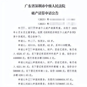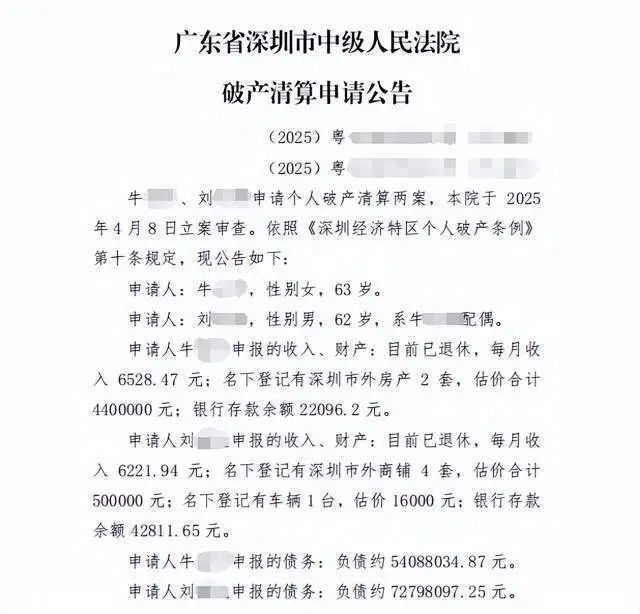 根据法院公告,牛某、刘某申请个人破产清算为两案,两个案件虽然合并公告,但使用不同的案号,深圳市中级人民法院于 2025年4月8日立案审查。